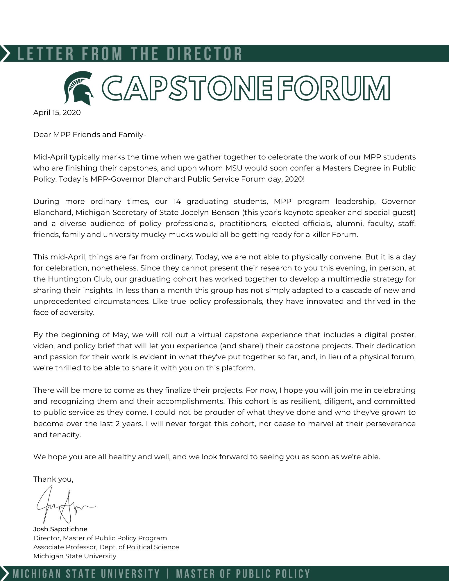 For more information about the Master of Public Policy program, go to https://polisci.msu.edu/mpp/index.html